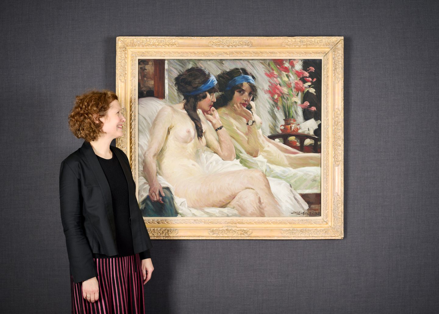 Painted on an ambitious scale, The Mirror is a tour de force full-length female nude, combined with reflection and an accomplished still-life passage. Cursiter’s sitter addresses the viewer via the titular mirror, whilst the double views of her face and watch provide focal points in the composition. A feathery technique can be compared to that of the Scottish Colourist F. C. B. Cadell’s work of the period, with careful attention played to the rounding of form and associated shadows.