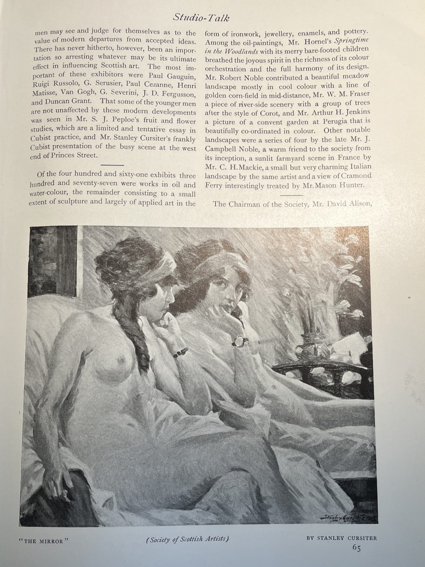 Cameron asked me to talk about Stanley Cursiter for BBC Radio Orkney focussing on the painting The Mirror of 1913. It is a major work from the period during which Cursiter emerged as a leading Scottish artist of his generation. Elected to the Society of Scottish Artists in 1906, it was a highlight of their Annual Exhibition, held in the Royal Scottish Academy Galleries in 1913-14. This was a landmark exhibition of international modern and contemporary art in Scotland, including – thanks to loans negotiated by Cursiter – works by the Italian Futurists Luigi Russolo and Gino Severini. The Mirror was also shown in the company of Post-Impressionists including Paul Cézanne, Paul Gauguin, Paul Sérusier and Vincent Van Gogh, as well as Henri Matisse and Pablo Picasso, as the society’s Hanging Committee successfully brought examples of the best in modern European art to an Edinburgh audience.